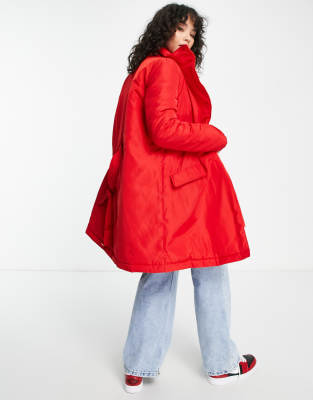 Love Moschino – Wattierter Mantel in Rot mit Logoband, Boutique Moschino Mantel Mit Pelzbesatz - Farfetch, Size 42AA Bras - Fine Lingerie.