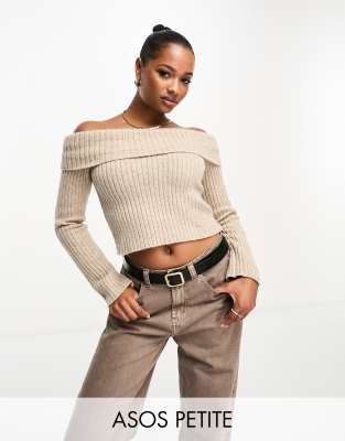 ASOS DESIGN Petite – Schulterfreier Pullover aus breitem Rippstrick in Haferbeige | ASOS