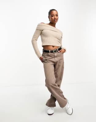ASOS DESIGN Petite – Schulterfreier Pullover aus breitem Rippstrick in Haferbeige